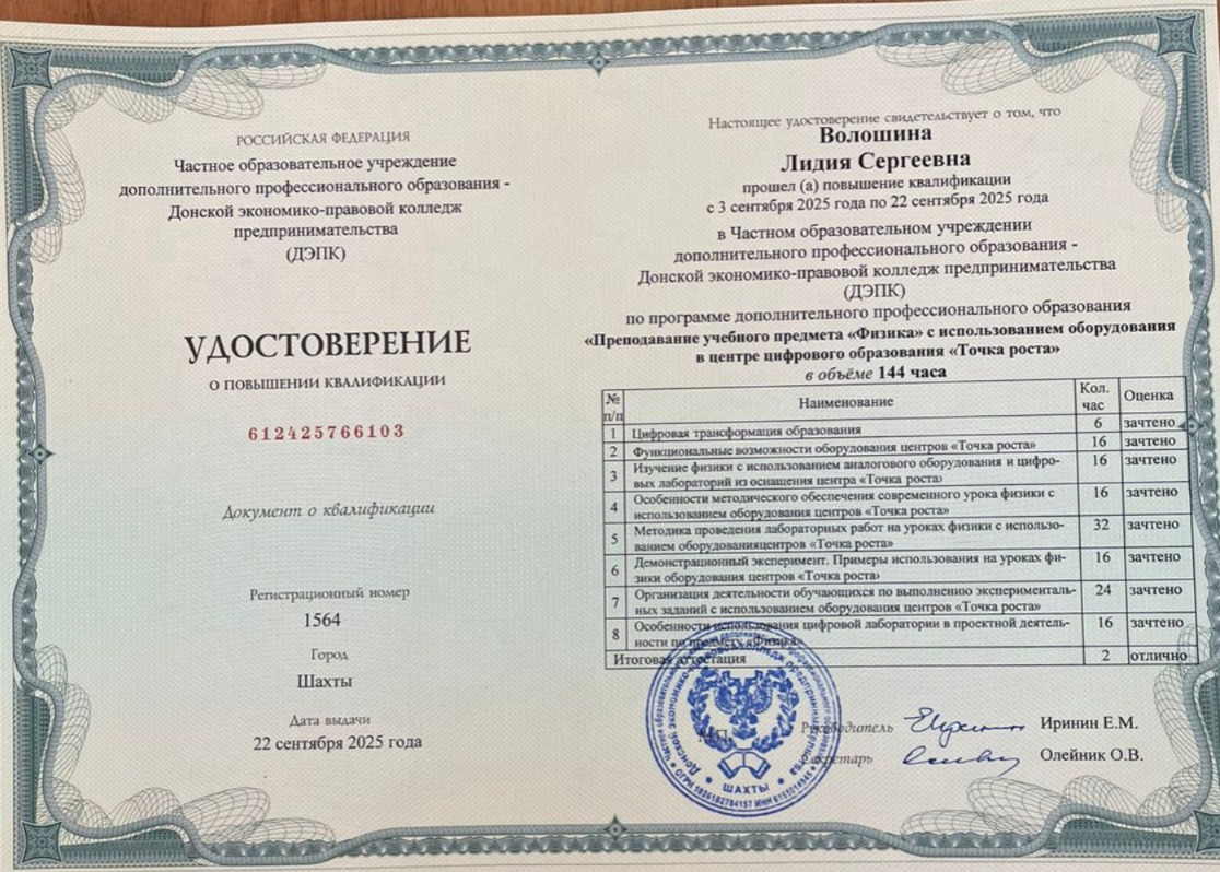 Образование: высшее, окончила СГПИ в 1974 году по специальности «Физика», преподаваемые дисциплины- физика, астрономия